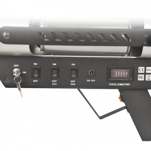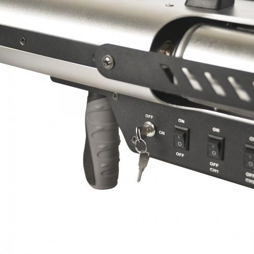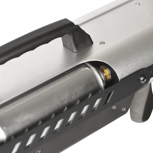 Die Firegun kann mit bis zu 2 Aerosol Dosen geladen werden, die entweder einzeln oder zusammen gezündet werden können, dadurch kann eine Effektweite von 1 bis zu 3m erzielt werden.