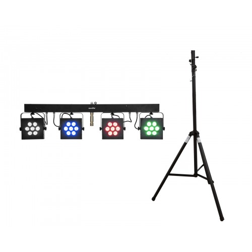 Bar mit 4 lichtstarken RGBAW/UV-Spots, QuickDMX, Fernbedienung und Tasche inkl. Stahlstativ