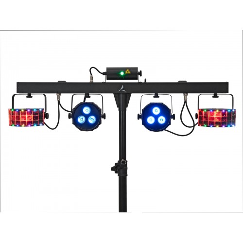 Bar mit 2 Spots, 2 Derbys, Show-Laser, Twinkle-Effekt, AirW-Funkeinheit (2,4 GHz) und Funkfernbedienung