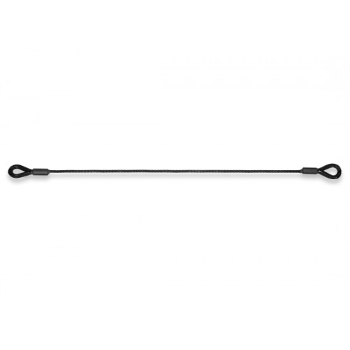 Schwarzes Drahtseil verzinkt ähnlich EN 12385-4, Konstruktion 7 x 19 mit Stahleinlage. Zwei schwarze Kauschen mit zylindrischen schwarzen Pressklemmen nach DIN 3093A. Tragfähigkeitsangaben nach DGUV.