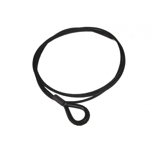 Schwarzes Drahtseil ähnlich EN 12385-4. Konstruktion 7 x 19 mit Stahleinlage. Mit einer schwarzen Kausche nach DIN 6899 Typ BF.