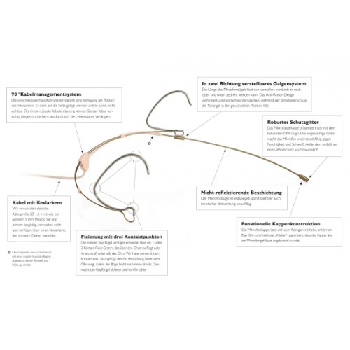 Der Kopfbügel in Universalgröße garantiert selbst bei langer Tragedauer Komfort, ohne Kompromisse bei der Sicherheit einzugehen. Er passt sich dezent und komfortabel der Kopf- und Ohrenform an und lässt sich einfach verstellen. Der Kopfbügel lässt sich schnell vor Ort an die individuelle Kopfform des Künstlers anpassen und sorgt somit immer für den perfekten Sitz.