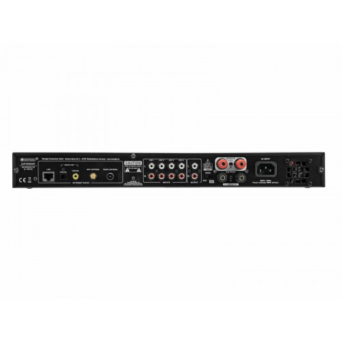 Stereo-Receiver mit Internetradio, DAB+, Bluetooth, 2 x 460 W / 4 OhmMit dem flachen Stereo-Receiver DJP-900NET hören Sie Netradio von tausenden, kostenlosen Sendern weltweit in bester Qualität. Der DJP-900NET unterstützt zudem das digitale Radio DAB+, das viele Vorteile gegenüber dem alten UKW hat. Der zukunftsfähige neue Radiostandard in digitaler Qualität ist rauschfrei, unabhängig vom Internet und beendet die lästige Frequenzsuche. Verbinden Sie das Gerät dazu einfach mit Ihrem WLAN-Netzwerk - schon holen Sie sich klaren Radioempfang in Ihr Ladengeschäft, Restaurant oder Fitnessstudio. Sollte das Radioprogramm Ihnen einmal nicht zusagen, können Sie die Bluetooth-Funktion des Receivers nutzen, um die Musik kabellos von Ihrem Bluetooth-Gerät zu übertragen. Der DJP-900NET erfüllt zudem den DLNA-Standard und kann Ihre im Netzwerk abgelegte Musikbibliothek streamen. Wählen Sie Ihre Audiodateien auf dem dimmbaren TFT-Farbdisplay einfach aus und spielen Sie die Musik dann über den Receiver ab. Der integrierte leistungsstarke Class-D-Verstärker stellt 2 x 460 Watt an 4 Ohm bzw. 2 x 240 Watt an 8 Ohm zur Verfügung und kann Musik von verschiedenen analogen und digitalen Quellen abspielen und regeln. Zur Bereitstellung der doppelten Ausgangsleistung lässt er sich auf Brückenbetrieb umschalten. Dann wird eine Leistung von 900 Watt erreicht. An die Schraubterminals können niederohmige Lautsprecher (4-16 Ohm) und 100-V-ELA-Lautsprecher angeschlossen werden. Für weitere digitale Endgeräte bietet der DJP-900NET zusätzliche Toslink- und Koax-Anschlüsse. Der DJP-900NET lässt sich einfach über das große Jogdial oder die mitgelieferte Fernbedienung steuern. Lieblingssender können bequem über eine Weboberfläche organisiert werden. Über verschiedene Equalizereinstellungen passen Sie den Sound genau Ihren Vorstellungen und Ihren Lautsprechern an. Praktisch sind auch der eingebaute Wecker und der Sleeptimer. Das widerstandsfähige Metallgehäuse besitzt eine Aluminumfrontplatte und Montageleistenfür die Rackmontage. Im Lieferumfang befinden sich eine deutsche Bedienungsanleitung, eine WLAN-Stabantenne sowie eine FM- und DAB-Wurfantenne und die Fernbedienung.Kompakter Stereo-Receiver mit Internetradio, DAB+, Bluetooth, 2 x 460 W / 4 Ohm