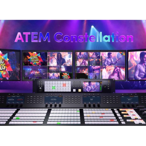Der ATEM 4 M/E Constellation 4K von Blackmagic Design ist ein gigantischer Live-Produktionsmischer für Ultra HD mit 4 M/E-Ebenen. Er verfügt über 40 skalierbare 12G-SDI-Eingänge, 24 x 12G-SDI-Aux-Ausgänge, vier DVE-Prozessoren, 16 ATEM Advanced Chroma Keyer, vier Media Player, vier unabhängige Ultra-HD-Multiviewer, zwei SuperSource Mehrebenen-Prozessoren und vieles mehr. Integriert sind zudem Talkback und ein professioneller Fairlight Audiomixer mit 156 Kanälen, EQ und Dynamiksteuerung.