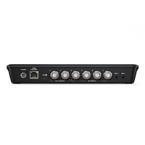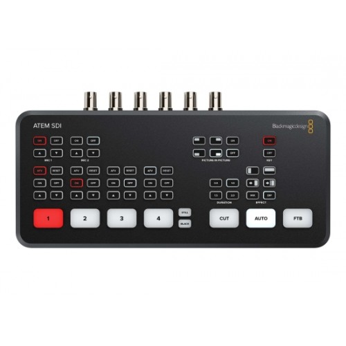 Das ATEM SDI Modell ist fix eingerichtet und bedienfreundlich. Es bietet vier skalierbare SDI-Eingänge, einen USB-Webcam-Ausgang, zwei SDI-Ausgänge, einen Fairlight Audiomixer mit EQ und Dynamiktools, einen DVE-Prozessor für Bild-im-Bild- und Übergangseffekte, einen Greenscreen-Chromakeyer und einen 20 Standbilder fassenden Media Pool für Titel. ATEM Software Control gibt’s kostenfrei dazu.