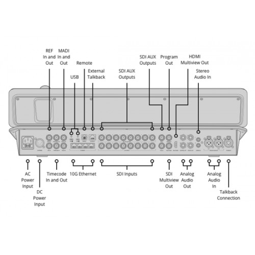 - Tally-Ausgang: Hinzugefügt via Ethernet-Verbindung mittels Blackmagic Design GPI and Tally Interface Gerät. (Nicht im Lieferumfang enthalten)