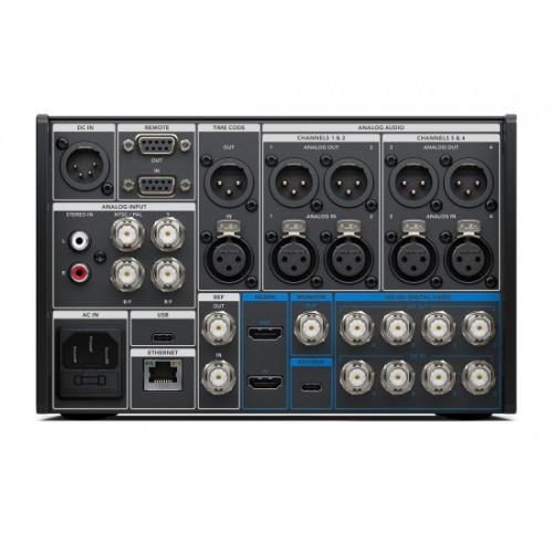- Analogaudio-Eingänge: 4 Kanäle für professionelles symmetrisches Analogaudio über XLR-Anschlüsse und 2 Kanäle für unsymmetrisches Consumer-Audio über RCA-Anschlüsse