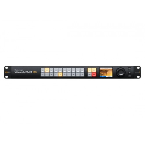 Die Blackmagic Videohub 20x20 12G ist eine fortschrittliche latenzfreie Kreuzschiene für beliebig kombinierte SD-, HD- und Ultra-HD-Videosignale, simultan auf derselben Kreuzschiene. Sie verfügt über zwanzig 12G-SDI-Eingänge, zwanzig 12G-SDI-Ausgänge plus Referenzanschlüsse und passt in eine Rack-Einheit. Auf dem Frontblenden-LCD sichten Sie Video vor dem Routing. Auch kann man dort Routing-Labels und Videonormen deutlich ablesen. Die Signalverteilung lässt sich direkt per Tastendruck oder mithilfe des großen Drehreglers vorgeben, der mit einer elektronischen Kupplung ausgestattet ist. Neben SDI-Reclocking und externer Steuerung per Ethernet werden alle SDI-Videonormen bis 2160p/60 unterstützt.