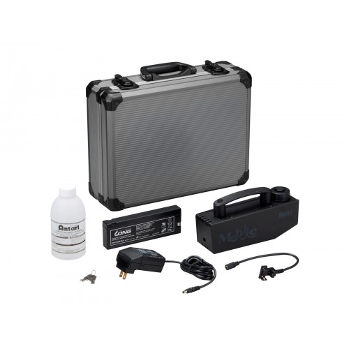 Die Antari MB-1 ist eine 75-W-Nebelmaschine, die von einer 12-V-Batterie betrieben wird. Ihr ultrakompaktes und leichtes Design eignet sich perfekt für die Platzierung in oder an Requisiten, in Kulissen sowie für den handgeführten Betrieb. Bei voller Leistung hält die Batterie bis zu 12 Minuten, und der 110-ml-Tank ermöglicht 100 Minuten Dauerbetrieb. Das Gerät wird in einem robusten Transportcase mit Akku, Ladegerät und einer Flasche Fluid geliefert. Eine Funk- und Timer-Fernbedienungslösung ist optional erhältlich, ebenso wie ein Netzteil mit Dummy-Batterie für den Dauerbetrieb am Stromnetz.Tragbare Akku-Nebelmaschine mit 75 W Leistung