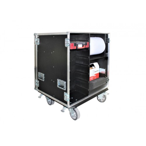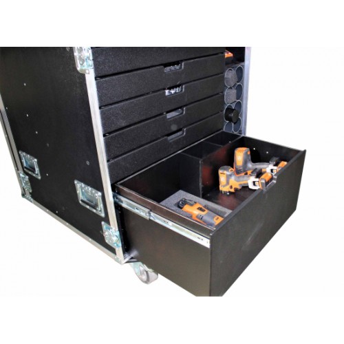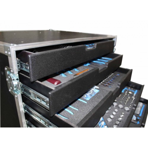 Universelles Schubladencase in Schwarz mit diversen Schubladen und Einlagen für übersichtliche Lagerung und sicheren Transport von Zubehör und Materialien. Das robuste Rollbrett mit BlueWheels sorgt für hohe Mobilität.