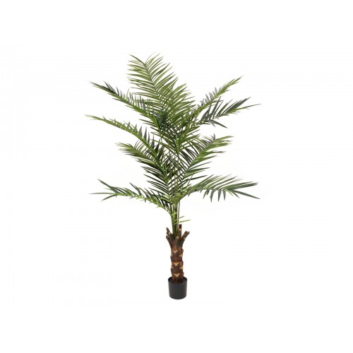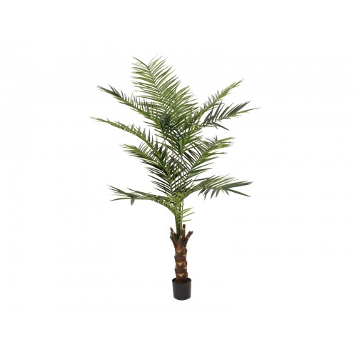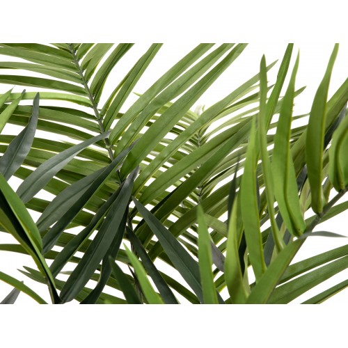 Mit der künstlichen Kentia Palme verleihen Sie Ihren Räumlichkeiten eine frische Atmosphäre ohne aufwändige Pflege.Als grüner Farbtupfer strahlt die Palme besonders im Büro oder im Homeoffice eine kraftvolle Ruhe und Gelassenheit aus. Zudem nimmt sie Ihnen im Gegensatz zu ihrem natürlichen Vorbild einen lichtarmen Standort nicht übel.Bei dem hochwertig gearbeiteten Kunststamm wurde zwischen einzelnen Stamm-Abschnitten auch echtes Palmfasermaterial eingearbeitet, um ein möglichst naturgetreues Erscheinungsbild zu erreichen. Die biegsamen Palmwedel mit Blättern aus Textilfasermaterial müssen beim Aufbau der Kunstpflanze nur noch in unterschiedlich hoch angebrachte Vorrichtungen eingesteckt werden.Die Palme wird bereits in einen schlichten Gärtnertopf geliefert und erreicht vom Topf bis zu den Palmwedelspitzen eine Gesamthöhe von ca. 240 cm.Tolle Deko in Wohn- und Geschäftsräumen