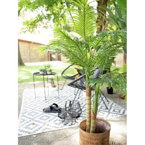 Ob für Ihre Wellnesslandschaft, den Wintergarten oder im gewerblichen Bereich - die mehrstämmige Betelnusspalme von Europalms ist die perfekte Ergänzung Ihrer Wohlfühloase.Denn während Echtpflanzen viel Licht und Wasser benötigen, ist diese Kunstpflanze absolut pflegeleicht und nimmt Ihnen selbst Temperaturschwankungen nicht übel.Die schlanke Fiederpalme besteht hier aus zwei, in der der Höhe unterschiedlich abgestuften, rohrähnlichen Stämmen, deren typische, ringförmige Blattnarben gut zu erkennen sind. Am oberen Ende der Stämme bilden lange Wedel eine Krone. Sie haben nur einen Blattstiel und wirken, als wären sie aus einem einzigen, ovalen Blatt entstanden.Ein schlichter Gärtnertopf dient als Standhilfe und erleichtert Ihnen das Eintopfen in einen passenden Übertopf.Üppiges Grün für Innenraum-Dekorationen