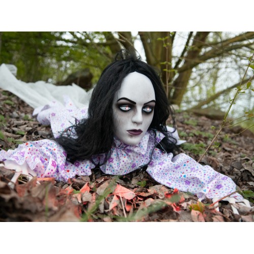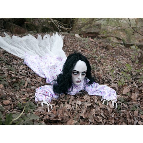 Diese animierte Halloween-Figur eignet sich sehr gut für Ihre Mottoparty, aber auch zur Dekoration von Geisterbahnen auf Volksfesten oder in Freizeitparks.In dem blassen Gesicht der jungen Frau sind deutlich die Spuren ihrer Flucht zu erkennen. Verzweifelt kriecht sie am Boden entlang, während ein schauriger Sound ertönt. Der mit einem gemusterten Kleid bekleidete Frauenoberkörper robbt durch eine eingebaute Mechanik jeweils ca. 50 cm nach vorne. Rot blinkende LED-Augen vervollständigen die Animation, welche per integriertem Mikrofon gestartet wird.Achten Sie bitte unbedingt auf ausreichend Platz, da diese Halloween-Figur von Europalms einen größeren Aktionsradius benötigt, um richtig wirken zu können.Weibliche Zombie-Dekofigur zum Legen
