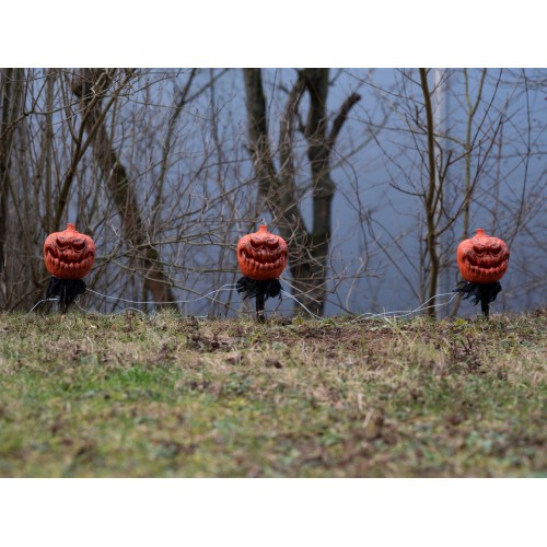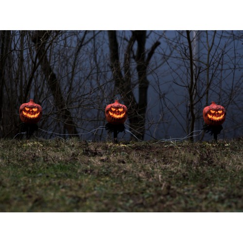 Das 3-teilige Halloween-Set ist eine schaurig schöne Gruseldekoration, die Besucher bereits im Vorgarten begrüßt.Jede Stableuchte besteht aus einem hohl ausgeschnitzten Kürbis aus Kunststoff mit gefährlich wirkender Gruselfratze. Im Inneren des Kürbiskopfes befinden sich am Boden 2 LEDs, die nach Aktivierung warmweiß leuchten. Eine gezackte, schwarze Halskrause aus halbtransparentem Stoff bildet den Übergang zu einem ca. 17 cm langen Erdspieß, der zur Befestigung der Stableuchte dient. Durch ein Kabel sind die Leuchten miteinander verbunden und können in einem Abstand von max. 50 cm in einem großen Pflanzkübel oder in weichem Erdreich eingesteckt werden.Die Aktivierung erfolgt über einen Taster am Batteriefach mit TIMER/ON/OFF-Funktion.Stableuchten-Set als Gartendekoration