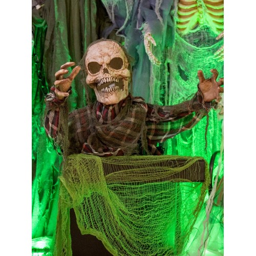 Ob auf dem Boden oder dem Buffet platziert - das Groundbreaker-Skelett darf auf keiner Motto- oder Halloweenparty fehlen.Die animierte Dekobüste von Europalms ist mit einem karierten Hemd bekleidet, über das ein grobmaschiger Stoff in olivgrün gelegt ist. Unter lautem Ächzen und Stöhnen versucht sich das Skelett-Monster aus dem Untergrund zu lösen. Dabei ist Gerassel von schweren Ketten zu hören, mit denen es anscheinend festgehalten wird. Verzweifelt wirft es seinen Kopf hin und her und versucht mit seinen Händen irgendwo halt zu bekommen. Sein hohler Schädel wird dabei geheimnisvoll in Grün erleuchtet.Per integriertem Mikrofon, über das Schalterpad "Step here" oder mit kabelgebundener, manueller Steuerung kann die Animation der Dekofigur aktiviert werden.Die Energieversorgung der Büste kann über Batteriebetrieb, USB-A-Kabel für den 5-V-Betrieb per Powerbank oder Netzteil erfolgen.Animierte Zombiefigur mit Licht- und Soundeffekt (Batterie- & USB-Betrieb)
