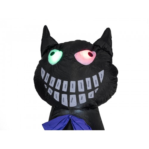 Entführen Sie mit dieser einzigartigen Dekoration Ihre Gäste in eine faszinierende Welt der Magie und des Mysteriums.Mit einem auffälligen, breiten Grinsen, das von einem Ohr zum anderen reicht, thront die schwarze Katze auf einem großen, orangefarbenen Kürbis mit Gruselfratze. Dieses Grinsen verleiht ihr ein übermütiges und zugleich mysteriöses Aussehen, das Neugier und Interesse weckt. Durch LEDs in Rot und Grün werden die Augen der Katze erleuchtet und verleihen ihr einen mystischen Glanz.Die Schutzklasse IP44 ermöglicht auch ein Aufstellen der Dekoration im geschützten Außenbereich.Und so einfach geht das:Für den Betrieb wird die Katze dauerhaft über eine zwei Meter lange Zuleitung an die Spannungsversorgung angeschlossen. Sie bläst sich dann allein zu ihrer vollen Größe auf. Für einen stabilen Stand sind zusätzlich Bodenspieße und Abspannschnüre beigepackt.Nach der Saison wird die Luft einfach abgelassen und schon kann die Figur wieder platzsparend zusammengefaltet werden und auf ihren nächsten Auftritt warten.Selbstaufblasende Halloweenszene als Dekorationsobjekt