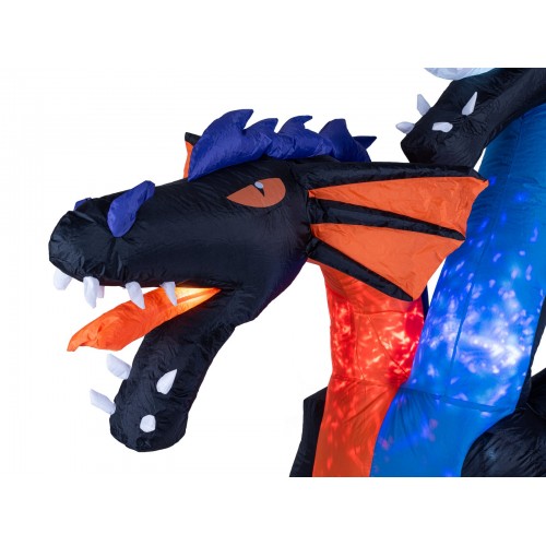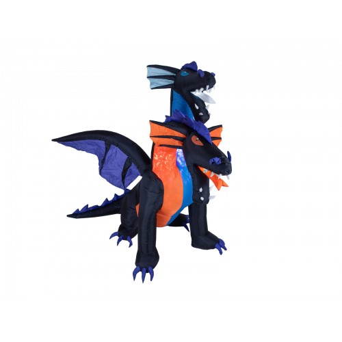 Bereit, dem Drachen ins Auge zu blicken?Majestätisch und zugleich furchteinflößend erhebt sich der schwarze zweiköpfige Drache von Europalms zu einer imposanten Größe von über zwei Metern.Gegensätzlich - wie Feuer und Eis - sind Brust und Hals des Drachens in leuchtendem Orange und mysteriösem Blau gehalten. Durch eingebaute LEDs wird dieser Effekt verstärkt, und der ganze Drache scheint vor Energie zu pulsieren.Dient er als aufmerksamer Wächter oder möchte er Angst und Schrecken verbreiten?Während bei einem Drachenkopf das Maul weit aufgerissen ist und den Blick auf seine spitzen scharfen Zähne freigibt, ist der andere Kopf nur halb erhoben. Dadurch kann er mit aufmerksamen Blicken seine Umgebung im Augenschein behalten. Auf alle Fälle sollte man sich vor seinen spitzen lila Krallen in Acht nehmen!Dieser imposante Aufblas-Drache ist ein "must have" für jede Motto-Dekoration und die Schutzklasse IP44 ermöglicht auch das Aufstellen im geschützten Außenbereich.Und so einfach geht das:Für den Betrieb wird der Drachen dauerhaft über eine zwei Meter lange Zuleitung an die Spannungsversorgung angeschlossen. Er bläst sich dann von allein zu seiner vollen Größe auf. Für einen stabilen Stand sind zusätzlich Bodenspieße und Abspannschnüre beigepackt.Nach der Saison wird die Luft wieder abgelassen und schon kann der Drache wieder platzsparend zusammengefaltet werden und auf seinen nächsten Auftritt warten.