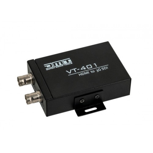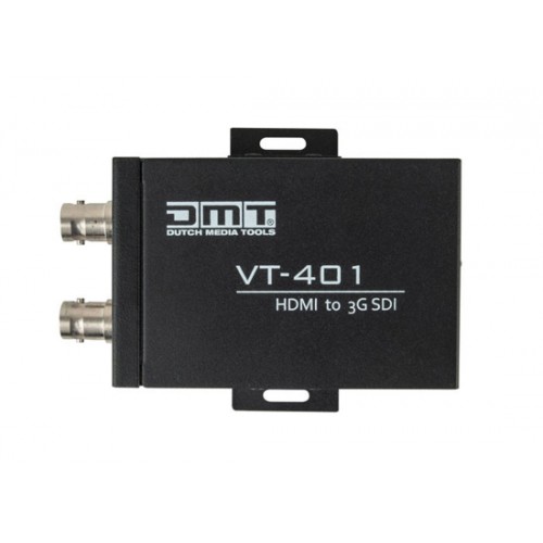 Der VT 401 ist ein kompakter Konverter, der ein HDMI-Signal in ein 3G-SDI-Signal umwandeln kann. Der VT-401 wird über einen Micro-USB-Anschluss mit Strom versorgt. Im Lieferumfang sind ein Netzteil mit Kabel sowie zwei Montagehalterungen enthalten, mit denen Sie den Wandler an einem Bildschirm oder Monitor befestigen können.