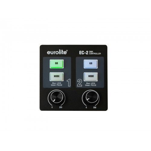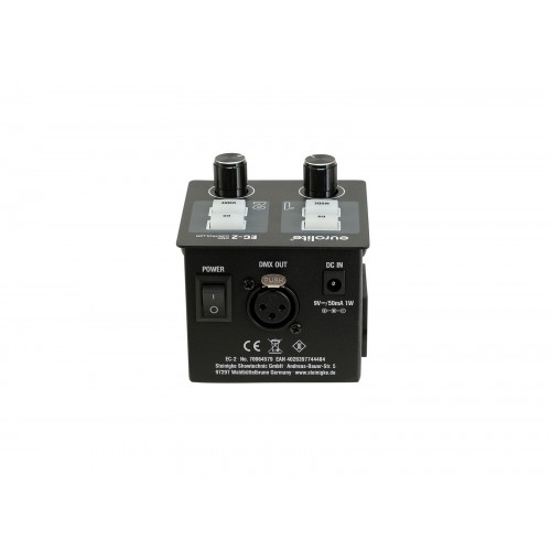 Der EC-2 ist ein kompakter 2-Kanal-DMX-Controller mit 3-poligem XLR-Anschluss. Er dient zur einfachen Steuerung von Nebelmaschinen, Stroboskopen, Blindern und anderen DMX-gesteuerten Geräten auf der Bühne. Pro Kanal sind eine hinterleuchtete Trigger- und Modus-Taste sowie ein Regler für die DMX-Werte vorhanden. Ein M10-Gewindeeinsatz ermöglicht die Befestigung z. B. an einem Mikrofonstativ. Ein Netzteil befindet sich im Lieferumfang. Der Betrieb mit einer 9-V-Batterie ist ebenfalls möglich.Kompakter 2-Kanal-DMX-Controller für Nebelmaschinen, Stroboskope, Blinder und andere Bühnenscheinwerfer