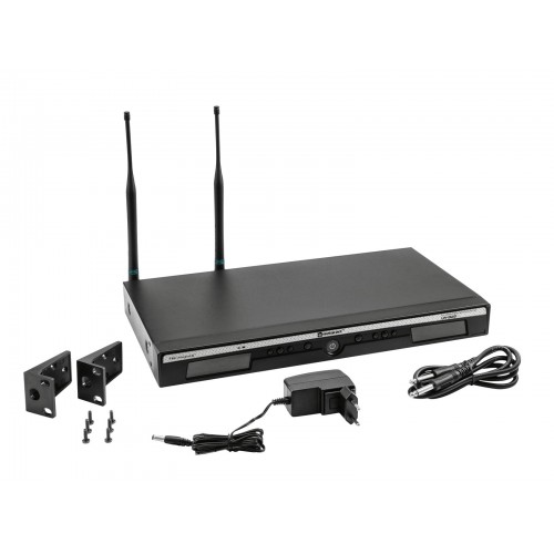 - 1 x Empfänger, 2 x Antenne, 1 x Externes Netzteil, 1 x Klinke Kabel, 2 x Montagebügel, 6 x Schrauben, 1 x Bedienungsanleitung, 1 x Konformitätserklärung
