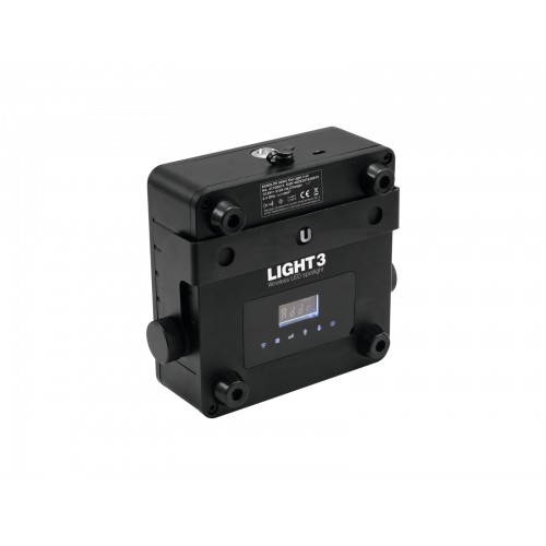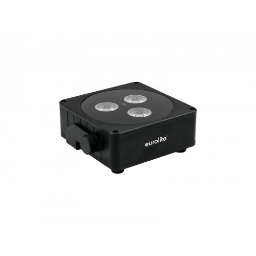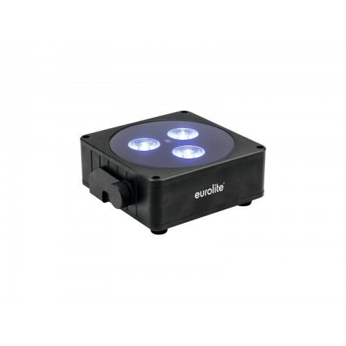 Flacher Scheinwerfer mit 3x8-W-RGBW-LED, Quick-DMX-Tranceiver & BügelDer flache Scheinwerfer EUROLITE AKKU Flat Light 3 ist kabellos, flexibel und vielseitig. Ausgestattet ist er mit drei leistungsstarken 8-Watt-LEDs (4in1) in Rot, Grün, Blau und Weiß. Wenn Sie auf der Suche nach einem Scheinwerfer sind, der nicht viel Platz beansprucht und für den Einsatz auf Bühnen, in Diskotheken, im Theater, an Bars oder auch mobil geeignet ist, bietet sich der AKKU Flat Light 3 an.Mit einer Betriebszeit von bis zu 16 Stunden im Betrieb über den eingebauten Akku punktet der Scheinwerfer gerade für Ihren mobilen Einsatz.Der kompakte und lichtstarke Scheinwerfer steckt in einem eleganten Gehäuse. Über den Bügel ist der Neigungswinkel manuell einstellbar.Neben statischen Farben mit stufenloser RGBW-Farbmischung können Sie auf interne Programme und einen Strobe-Effekt mit variabler Geschwindigkeit zurück greifen. Der Dimmer mit einstellbarer Dimmergeschwindigkeit und die Musiksteuerung bieten Ihnen weitere Möglichkeiten.Ansteuern können Sie das Flat Light 3 per DMX mit Master/Slave Funktion, mit der mitgelieferten Infrarot-Fernbedienung, im Standalone-Betrieb und über den integrierten QuickDMX-Funksender/-empfänger für die drahtlose Übertragung von DMX512-Signalen.Die Adressierung und Einstellung können Sie außerdem bequem über das Control-Board mit berührungsempfindlichen Tasten und LCD vornehmen.Zusätzlich ist das Flat Light 3 mit einem Kensington-Sicherheitsanschluss ausgestattet, mit dem Sie Ihr Gerät gegen Diebstahl absichern können.Flacher Scheinwerfer mit 3x 8-W-RGBW-LED, QuickDMX-Transceiver und Bügel