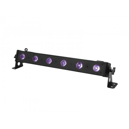 Lichteffektleiste (50cm) mit UV-LEDsDie leistungsstarke und dimmbare Lichteffektleiste EUROLITE LED BAR-6 UV ist mit sechs 1-W-UV-LEDs ausgestattet. Durch die Konvektionskühlung ist die LED BAR geräuschlos und bietet Ihnen vielseitige Einsatzmöglichkeiten. Ob auf Events oder für Bandauftritte - ob im Theater oder auf Galas - die LED Bar-6 UV ist variabel einsetzbar. Die Ansteuerung erfolgt über DMX, auch der Master-Slave-Betrieb ist möglich. Die LED-Bar hat zusätzlich eine phantomgespeiste USB-Buchse für einen QuickDMX-Empfänger. Dieser ist optional erhältlich. Im Auto- und Musikmodus können Sie zusätzlich integrierte Showprogramme ansteuern. Adressierung und Einstellungen können Sie über die integrierte Steuereinheit mit 4-stelliger LED-Anzeige tätigen. Die Netzanschlüsse erlauben es Ihnen, bis zu acht Geräte in Reihe zu betreiben.LED-Leiste (50cm) mit 6 x 1-W-ultraviolett (UV) LED