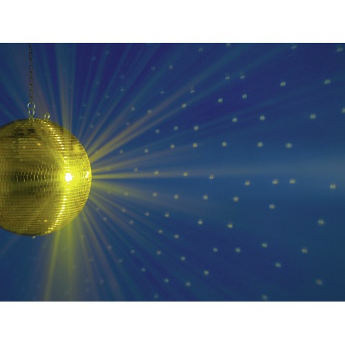 Keine Party ohne Diskokugel! Mit ihrem einfachen Design und erschwinglichen Preis, ist die Diskokugel ein beliebter Deko-Klassiker, der gern eingesetzt wird, um faszinierende Lichtspiele auf der Tanzfläche zu erzeugen. Eurolite bietet gleich eine ganze Reihe an Kugeln in unterschiedlichen Farben und Größen an.Dieses Modell in Profiqualität hat einen Durchmesser von 40 cm und ist mit unzähligen kleinen goldfarbenen Spiegeln (10 x 10 mm) bedeckt. Ihr formstabiler Kunststoffkern ist mit einer durchgehenden Achse versehen, die eine hohe mechanische Zugfestigkeit gewährleistet. Zwei Ösen ermöglichen die Montage der Befestigungskette und der geforderten Absturzsicherung. Wahlweise können Sie auch einen Motor verwenden, damit sich die Kugel automatisch dreht.Passende Motoren, das nötige Montagematerial und ein Transportcase sind als Zubehör erhältlich.Sicherheits-Spiegelkugel mit Facetten in gold