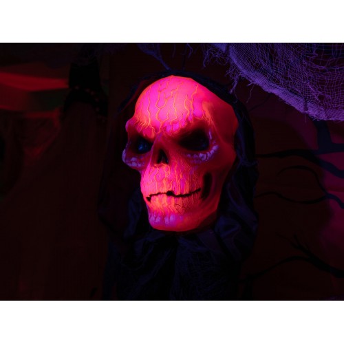 Der Blut-Totenkopf von Europalms ist die ideale Ergänzung Ihrer Halloween- oder Motto-Dekoration.Unter einer zerfetzten schwarzen Kapuze lauert ein markanter, mit blutroten Adern durchzogener Totenkopf, gespannt auf die eintreffenden Besucher. Der "Blut-Effekt" wird durch eine blinkende, rote LED im Inneren des Skelettschädels verstärkt. Gleichzeitig ertönt eine schaurige Stimme und Geisterbahnsound.Die Animation wird über einen Bewegungsmelder (Lichtsensor am Mund) oder eine kabelgebundene, manuelle Steuerung aktiviert.Totenschädel zum Hängen mit Licht- und Soundeffekt
