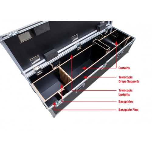 Bitte beachte, dass die Stangen hinten im Case und die Vorhanghalterungen im vorderen Fach untergebracht werden müssen. Die Stangen sollten übereinander gelegt werden, wobei jede Stange in die entgegengesetzte Richtung der vorherigen zeigt. Aufgrund seines Gewichts darf dieses Case nicht gekippt werden. Wenn du eine vertikale Lösung benötigst, wirf bitte einen Blick auf den Pipe & Drape Transportwagen (SHT89613).