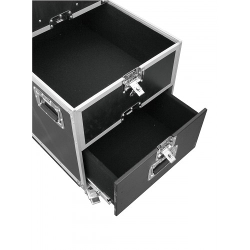 Zeigt was er hat!Es gibt Cases, die können nicht viel mehr bieten als fünf Wände und eine Tür. Nicht so allerdings unser Universal Roadie Case. Dieses Schmuckstück hat nämlich neben seinen drei, ohnehin schon großzügigen Sektionen - die obere ist nochmals in drei kleinere Einheiten unterteilt - ein besonderes Glanzlicht zu bieten: alle drei Sektionen können gleichzeitig geöffnet und benutzt werden. Unten wird eine Schublade nach vorne und die obere Sektion wird nach hinten geschoben. Et voilà! Es kann also jederzeit auf alle im Case befindlichen Utensilien zurückgegriffen werden. Dabei ist der mittlere Teil auch als Ablage für schwere Gegenstände ohne Weiteres zu nutzen.Schubladencase mit Lenkrollen