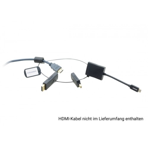 AD−RING ist ein Ring aus Edelstahl von HDMI−Adaptern, der an deinem Display−Kabel befestigt wird, so dass andere Präsentationsquellen an das HDMI−Kabel angeschlossen werden können. Laptops, Tablets, Smartphones, Digitalkameras und Netbooks haben eine Vielzahl von Anschlüssen, um ihren Inhalt anzuzeigen. AD−RING bietet dem Moderator einfachen Zugang zum passenden Adapter für den Anschluss an die HDMI−Verbindung. Diese einfache und effektive Lösung unterstützt den Inhalt von Mobilgeräten und hält die Adapter sicher und am Platz für den nächsten Vortragenden.