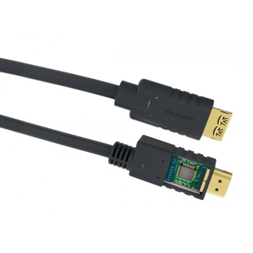 Das aktive HDMI−Kupferkabel von CA−HM bietet eine perfekte Kabellösung für die Übertragung von HDMI−Signalen über große Distanzen: 18 GBit/s bis 20 m, 10,2 GBit/s bis 25 m und 6,75 GBit/s bis 30 m. Die innovative Technologie, die im Stecker des Kabels verwendet wird, zeichnet sich durch hervorragende Entzerrung und Signalkompensation aus, um den anspruchsvollsten Herausforderungen in Pro−AV−Installationen gerecht zu werden. Diese einzigartige Lösung vereinfacht die Ferninstallation durch Verwendung eines echten Plug and Play−Kabels, das Strom von der HDMI−Quelle bezieht. Es besteht keine Notwendigkeit für eine externe Stromquelle. CA−HM verfügt über den exklusiven K−Lock−HDMI−Anschluss von Kramer, der verhindert, dass Kabel in Ihrer Installation unbeabsichtigt getrennt werden, wodurch kabelgebundene Serviceanrufe vermieden werden. Zusätzlich zeigt eine LED am Anschluss an, wenn das Signal erfolgreich übertragen wird.