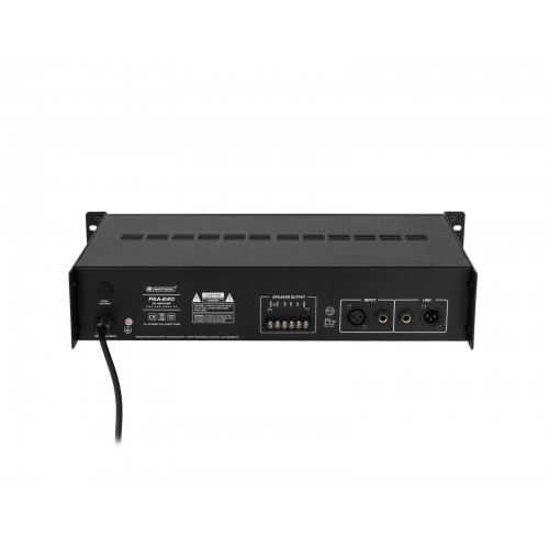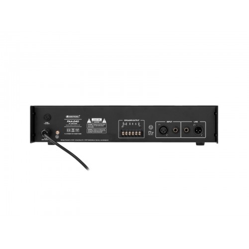 ELA-Verstärker, 240 W RMS1 Line-Eingang (wahlweise XLR oder 6,3-mm-Klinke)1 Durchschleifausgang (wah..
