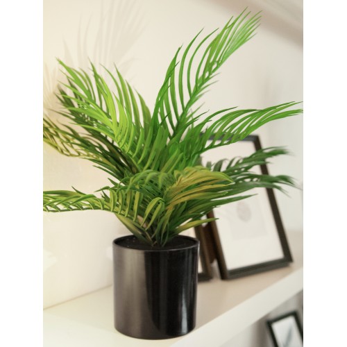 Ob für Arbeitsbereiche im Homeoffice oder in Großraumbüros oder als Tisch- und Thekendekoration für Wohn- und Geschäftsräume: Die künstliche Mini-Goldfruchtpalme bringt frisches Grün in Ihre Räumlichkeiten. Als Zimmerpflanze findet sie überall ihren Einsatz, wo nur wenig Platz zur Verfügung steht.Von den rohrähnlichen Trieben ist bei dem künstlichen Setzling einer Areca-Palme nur das gefiederte Blattwerk als buschig verzweigte Wedel zu sehen. Diese wurden komplett aus PE gefertigt - so kann die Pflanze auch im geschützten Außenbereich ihren Einsatz finden.Der im Lieferumfang enthaltene Basis-Gärtnertopf ist mit künstlicher Erde bedeckt und kann sowohl als Standhilfe für einen Übertopf dienen, als auch als Deko-Topf verwendet werden.Junge künstliche Areca-Palme aus PE