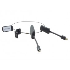AD-RING ist ein Ring aus Edelstahl von HDMI−Adaptern, der an Ihrem Display-Kabel befestigt wird, so dass andere Präsentationsquellen an das HDMI−Kabel angeschlossen werden können. Laptops, Tablets, Smartphones, Digitalkameras und Netbooks haben eine Vielzahl von Anschlüssen, um ihren Inhalt anzuzeigen. AD-RING bietet dem Moderator einfachen Zugang zum passenden Adapter für den Anschluss an die HDMI-Verbindung. Diese einfache und effektive Lösung unterstützt den Inhalt von Mobilgeräten und hält die Adapter sicher und am Platz für den nächsten Vortragenden.