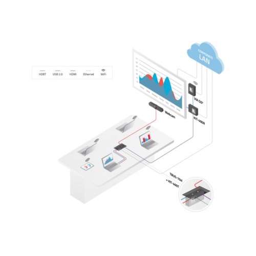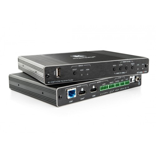 KIT−400 ist ein Hochleistungs Automatik−Umschalter/Scaler Set für HDMI und VGA Signale über HDBaseT mit integrierter Raumautomation. Das Kit enthält den KIT−400T Übertrager/Umschalter und den KIT−400R Empfänger/Scaler. Der KIT−400T Überträger leitet das durch den Benutzer ausgewählte Eingangssignal per HDBaseT an den Empfänger. Der Empfänger KIT−400R wandelt das HDBaseT Signal zu HDMI und skaliert es entsprechend seiner Einstellung auf bis zu 4K 60Hz 4:4:4. Alternativ kann der KIT−400R das an seinem lokalen HDMI Eingang anliegende Signal skaliert ausgeben. KIT−400 ermöglicht eine Reichweite bis zu 40 m bei 4K 60Hz 4:2:0 oder bis zu 70 m bei 1080p60.
