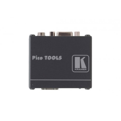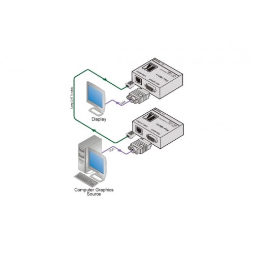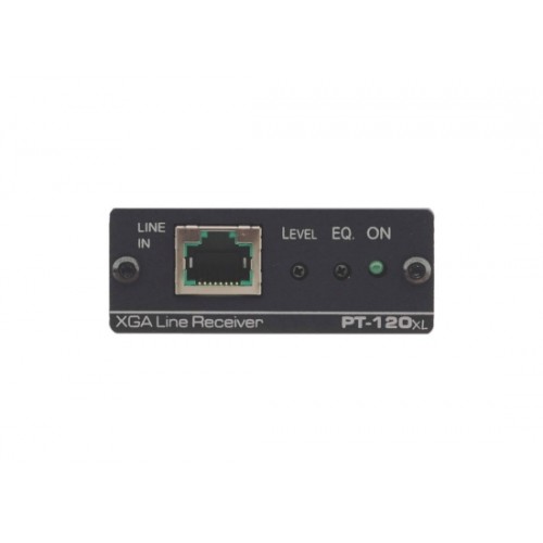 PT−120xl ist ein Twisted Pair Empfänger mit vergrößerter Reichweite für Computergrafik−Videosignale. Er wandelt ein Twisted Pair Signal von einem WP−110 Übertrager (oder anderen kompatiblen Kramer Übertragern) zurück in ein Computergrafik−Signal.