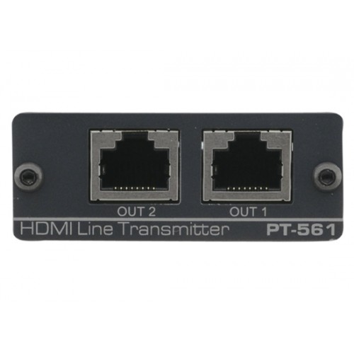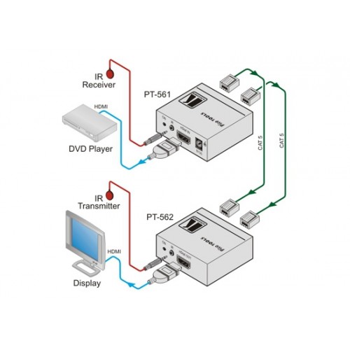PT−561 und PT−562 sind Twisted Pair Übertrager und Empfänger für IR− und HDMI−Signale. Der PT−561 wandelt ein IR− und HDMI−Signal in ein Twisted Pair Signal, der PT−562 wandelt das Signal zurück in ein HDMI− und IR−Signal.