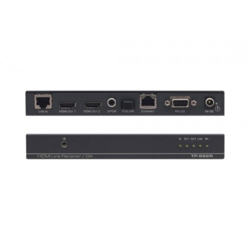 TP−582R ist ein hochwertiger HDBaseT Twisted Pair Empfänger für HDMI−, Ethernet−, bidirektionale RS−232 und IR−Signale. Der TP−582R wandelt das empfangene Twisted Pair Signal zurück in ein Ethernet 100BaseT, RS−232, IR und zwei HDMI−Ausgangssignale. Außerdem koppelt er Audio aus und gibt es digital als S/PDIF und TOSLINK® aus. Das Videosignal mit max. 1080p @60 Hz, 36 bpp wird dabei bis 130 m über CAT−Kupferkabel übertragen.