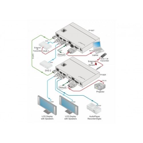 - Hochleistungs–Reichweitenverlängerer — Professionelle HDBaseT–Verlängerung mit vergrößerter Reichweite für Twisted Pair Kupferkabel mit gespiegeltem 1+1 HDMI–Ausgang. TP–582R kann direkt mit HDBaseT–konformen marktüblichen AV–Produkten betrieben werden. Für optimale Reichweite und Leistung verwenden Sie die empfohlenen Kramer–Kabel.