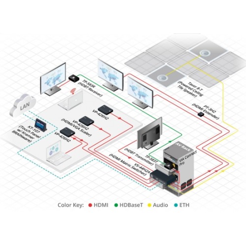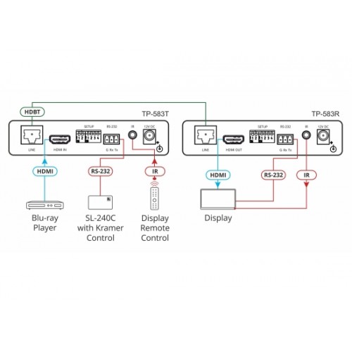 TP−583T ist ein leistungsstarker HDBaseT−Sender mit hoher Reichweite für 4K−HDR−HDMI−, RS−232− und IR−Signale über verdrillte Doppelleitungen. TP−583T wandelt alle Eingangssignale in das übertragene HDBaseT−Signal um. Es überträgt Videosignale über Kramer−Kupferkabel auf bis zu 70 m (230 ft) bei bis zu 4K@60Hz (4:4:4) Videoauflösungen. Es ist mit Standard−HDBaseT−kompatiblen Extendern bei 4K@30Hz und HD−Videoauflösungen kompatibel.