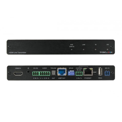 TP−594Txr ist ein leistungsstarker, reichweitenstarker HDBaseT 2.0 Sender für 4K60Hz (4:4:4:4) HDR, HDMI, Ethernet, RS−232, IR, ARC und Stereo−Audiosignale über Twisted Pair. Er wandelt alle Eingangssignale in das übertragene HDBaseT 2.0−Signal um und ermöglicht das Routing des empfangenen ARC−Signals zum HDMI−Eingang und zu den Digital/Analog−Audio−Ports. Er erweitert Videosignale bis zu 100m (330ft) über CAT−Kupferkabel bei bis zu 4K@60Hz (4:4:4:4) 24bpp Videoauflösung und bietet noch mehr Reichweite für niedrigere HD−Videoauflösungen. Der analoge Anschluss ermöglicht auch die Einbindung von Audio in das HDBaseT−Signal.