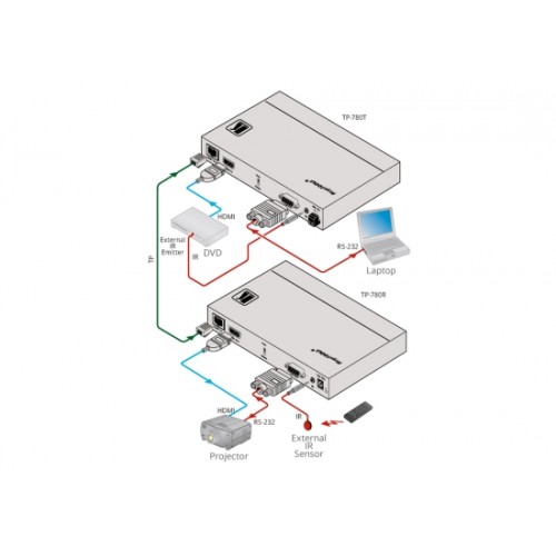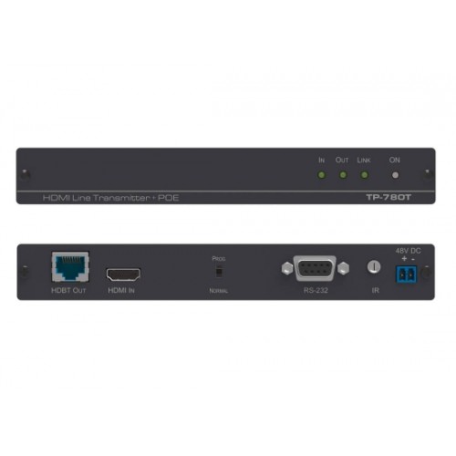 TP−780T ist ein Twisted Pair Übertrager für HDMI, bidirektionales RS−232 und IR. Er unterstützt Auflösungen bis 4K @60 Hz (4:2:0) UHD. Das Gerät wandelt HDMI, RS−232 und IR Signale in ein TP−Signal und überträgt dies an einen Empfänger TP−780R, der das TP−Signal wieder zurück in HDMI, bidirektionales RS−232 und IR wandelt. Der TP−780T unterstützt PoE.
