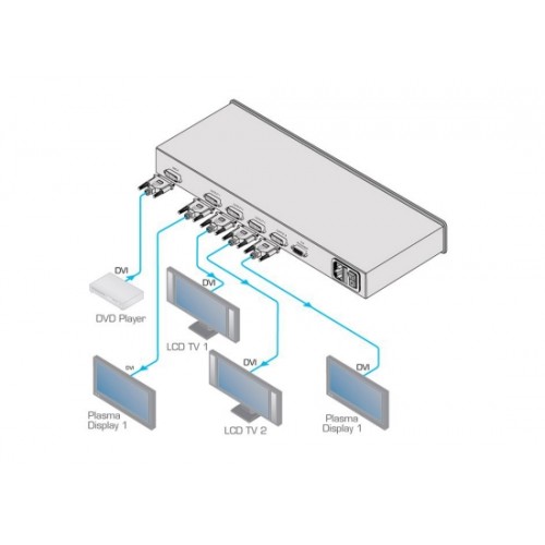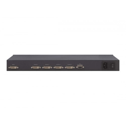 Der Kramer VM−4HDCPxl ist ein HDCP−konformer Verteilverstärker für DVI−D Signale mit Auflösungen bis zu 1080p oder UXGA. Er nimmt ein Eingangssignal entgegen, führt Neutaktung und Entzerrung durch und verteilt das Signal an vier identische Ausgänge.