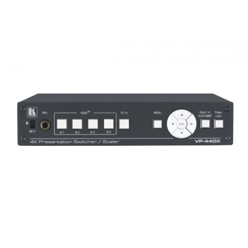 VP−440X ist ein hochleistungs 18G Präsentationsumschalter und Scaler mit vier HDMI Eingängen und einem VGA Eingang. Das Gerät passt die Videosignale entsprechend seiner Einstellung an, bettet Microfon und optionale, analoge Audiosignale ein und gibt das Signal parallel auf den beiden Ausgängen HDMI und HDBaseT aus. Der in dem Videosignal enthaltene Ton wird gleichzeitig auf dem analogen Audio−Ausgang ausgegeben. Über HDBaseT überträgt das Gerät Video Signale bis zu 40 Meter weit bei 4K 60Hz (4:2:0) und 70 Meter bei 1080p60 Timings.