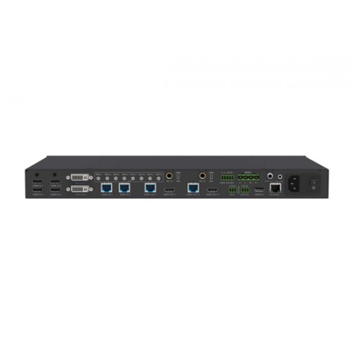 Du kannst ihn an zwei unabhängige HDMI-Ausgänge skalieren, wobei jeder Ausgang einen parallelen HDBaseT-Ausgang bietet. Das Gerät unterstützt sowohl analoge als auch eingebettete Audio-Ein- und Ausgänge sowie einen Audio-DSP.