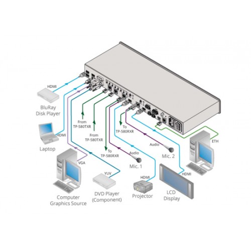 - Eingänge — Wahl zwischen HDMI, VGA, YUV oder CV an zwei DVI–U-Eingängen, 4x HDMI und 2x HDBaseT.