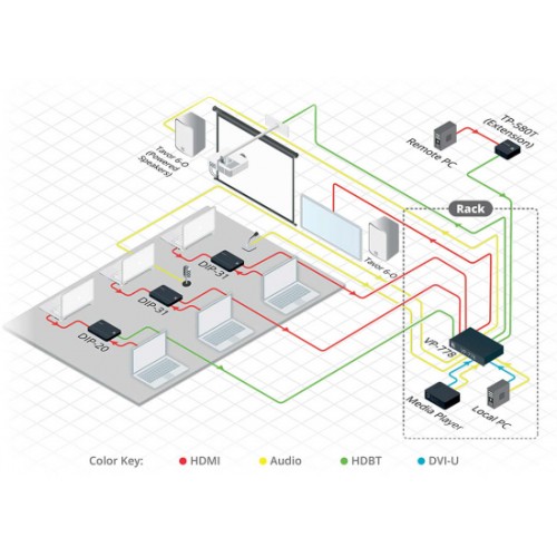 Es stehen dir zwei Mikrofon-Eingänge zur Verfügung, ebenso wie Ausgänge für digitales und analoges symmetrisches Stereo-Audio sowie verstärkte Lautsprecher-Ausgänge. Der VP-778 lässt sich bequem über eingebaute Web-Seiten sowie RS-232 und IR steuern.