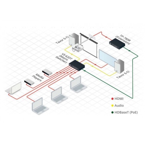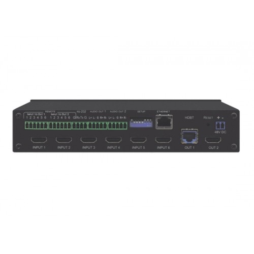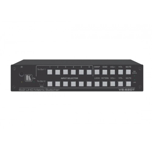 VS−62DT ist ein 6x2 Matrixschalter für 4K @60 Hz (4:2:0) HDMI/HDBaseT Signale mit HDMI und HDBaseT Ausgangsübertragern für Video und Audio mit vergrößerter Reichweite. Auflösungen bis 4K @60 Hz (4:2:0) und WUXGA werden unterstützt. Das Gerät liefert Stromversorgung über Ethernet (PoE) an entsprechend ausgerüstete Empfänger.