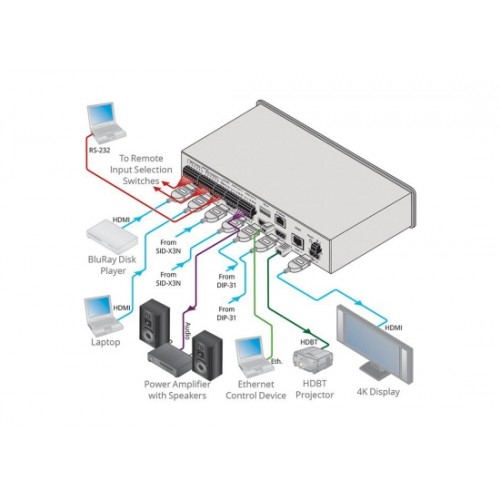 - Steuerung: Fronttasten, IR–Fernbedienung, RS–232, Ethernet, Eingangswahl per Schließkontakt mit LEDs, eingebauter Web–Browser